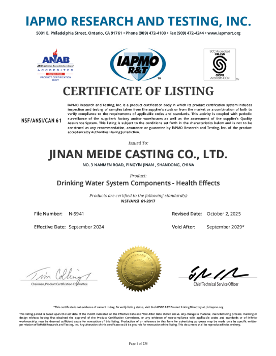 Meide Group’s stainless steel grooved fittings have obtained the NSF-61 certification.