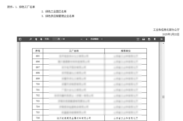 2025年1月23日,中華人民共和國工業(yè)和信息化部正式發(fā)布了《2024年度綠色制造名單通知》,臨沂玫德庚辰金屬材料有限公司(以下簡稱“玫德庚辰”)成功入選國家級綠色工廠名單。與此同時,臨沂臨港經(jīng)濟(jì)開發(fā)區(qū)也榮耀上榜,成為綠色工業(yè)園區(qū)的一員。這一喜訊標(biāo)志著玫德庚辰在綠色轉(zhuǎn)型道路上邁出了堅實(shí)的一步,也為臨沂臨港經(jīng)濟(jì)開發(fā)區(qū)的綠色發(fā)展注入了新的活力。