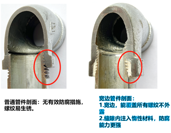 區(qū)別于傳統(tǒng)管件,玫德寬邊瑪鋼燃氣管件采用突破性的寬邊構(gòu)造,能將所有螺紋緊密覆蓋,使其完全不外露。這一設(shè)計從根本上消除了因螺紋裸露,在長期使用過程中可能因磨損、松動而引發(fā)燃氣泄漏的風(fēng)險。對比普通燃氣管件連接時,鋼管會有 2 - 3 扣螺紋暴露在外的情況,玫德管件的安全性得到了質(zhì)的提升。